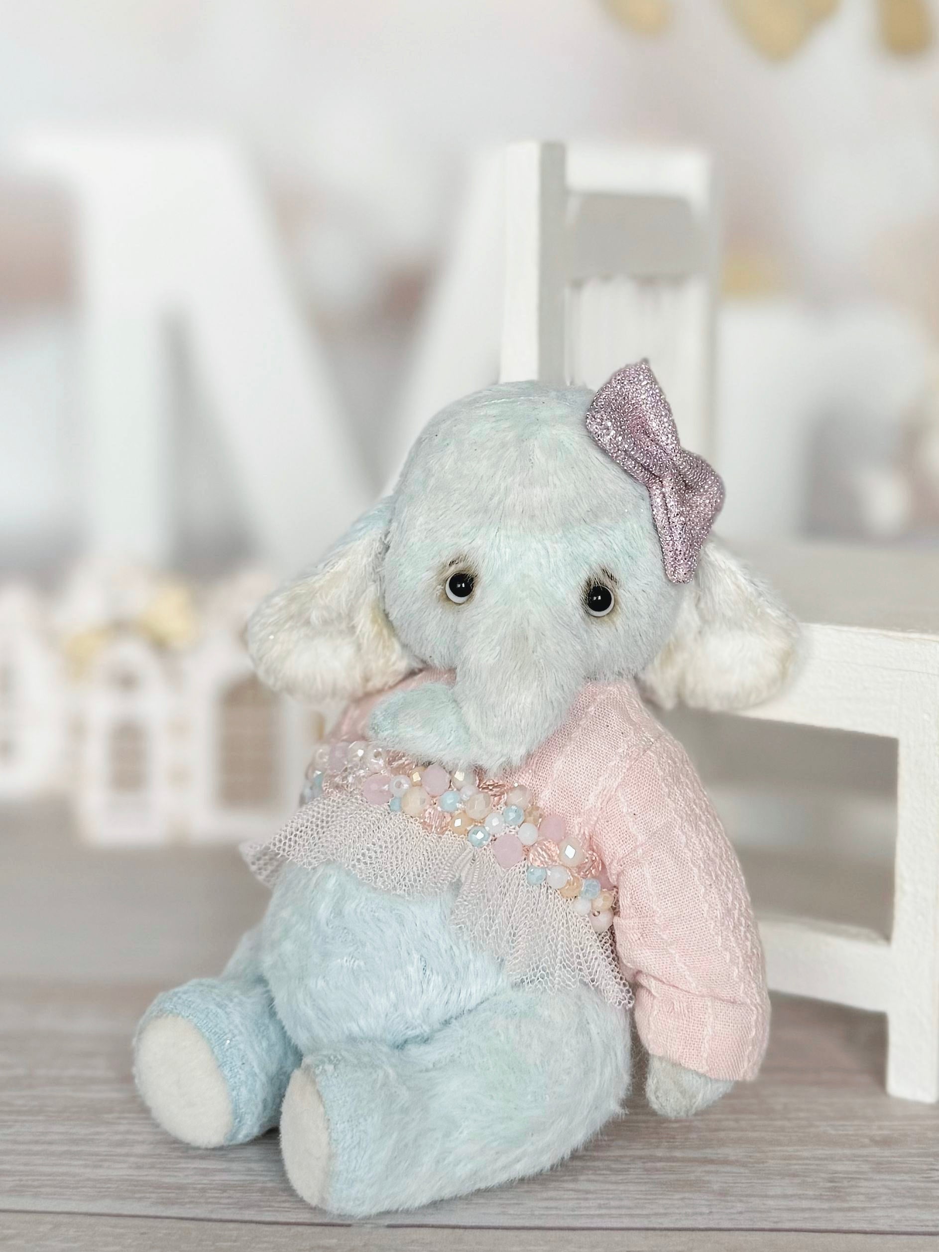 Meet Luna — a gentle little elephant with a soft, dreamy expression. Made from pale blue German viscose, Luna wears a delicate pink dress with a light tulle collar decorated with tiny pastel beads, and a small shimmering bow on her head. All details are carefully handmade.